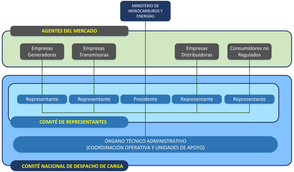 El Presidente que es nominado por el Ministerio de Hidrocarburos y Energías, un representante de las empresas generadoras, un representante de las empresas transmisoras, un representante de las empresas distribuidoras y un representante de los consumidores no regulados.