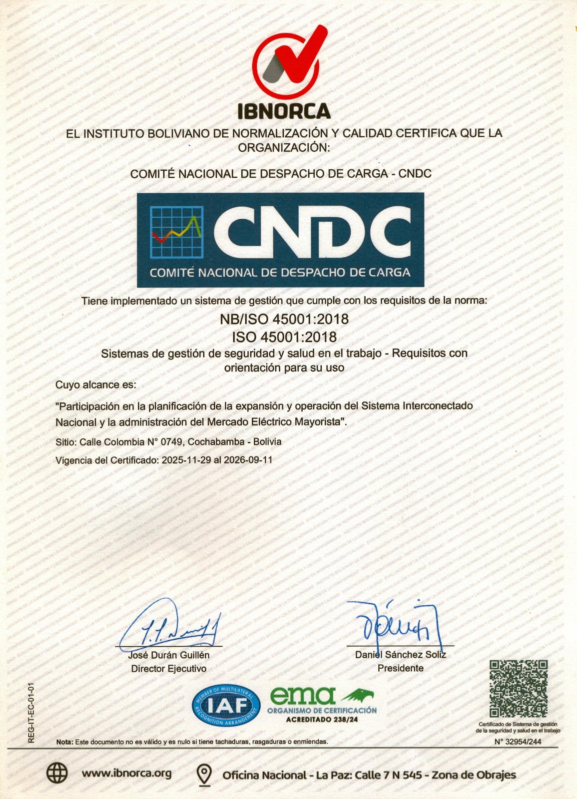 Como muestra de un firme compromiso con la seguridad y la salud de su personal y el cumplimiento eficiente de los requisitos legales bolivianos en esta materia, el CNDC ha implementado un Sistema de Gestión de la Seguridad y Salud en el Trabajo bajo el estándar internacional ISO 45001, mismo que se encuentra certificado desde septiembre del 2023.